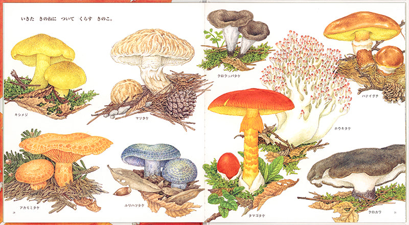 いつの間にか生えて、いつの間にか無くなる不思議な存在、きのこ。日本の菌類画の第一人者がその正体に迫ります。様々なところで育つ色とりどりの美しいきのこをご紹介。