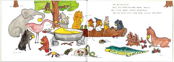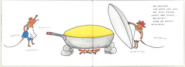 野ねずみのぐりとぐらは森で大きな卵を見つけ、かすてらを作ることにしました。歌いながら焼けるのを待っていると、においにつられて動物たちが集まってきました。