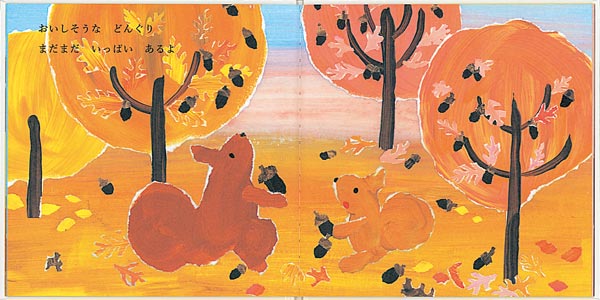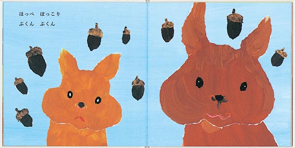 子リスのぐるぐるちゃんは、秋の森でお母さんと一緒にどんぐり拾い。あーん、と口にどんぐりを入れてもらったぐるぐるちゃん。ほっぺにいっぱいほおばって、うれしいな!