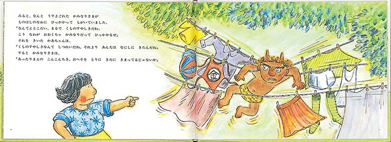 洗濯が大好きなかあちゃんは、家中のものすべてを洗って干してしまいます。落ちてきた雷さまも汚いからとゴシゴシ洗濯すると、目も鼻も口もなくなってしまいました!