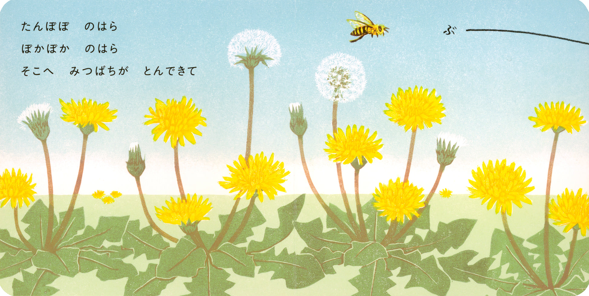 春の日ざしのそそぐ、たんぽぽ野原。みつばちがとんできて、たんぽぽの花のみつをちゅるちゅる吸います。次にとかげがやってきて、たんぽぽの横でひなたぼっこ。続いてすずめがとんできて、種をパクパク食べます。最後にやってきた子どもがたんぽぽをつつくと、綿毛がふわ~と飛んでいきます。「たんぽぽのはら ぽかぽかのはら」というおだやかな言葉の繰り返しにのせて、たんぽぽと次々やってくるいきものとのドラマをえがきます。