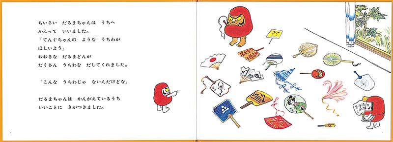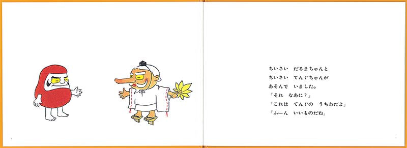だるまちゃんは友だちのてんぐちゃんの持っている、てんぐのうちわや素敵な履物、長い鼻がほしくてお父さんにねだります。ユーモアあふれる物語と楽しいものづくしの絵本。