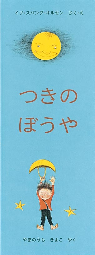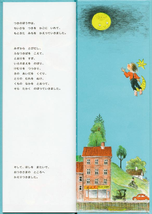 水にうつったお月さまを訪ねて、月の使いの男の子が地球にやってきます。飛行機に会ったり鳥にかこまれたり、空からおりてくる男の子の冒険が、縦長の絵本の中で展開します。