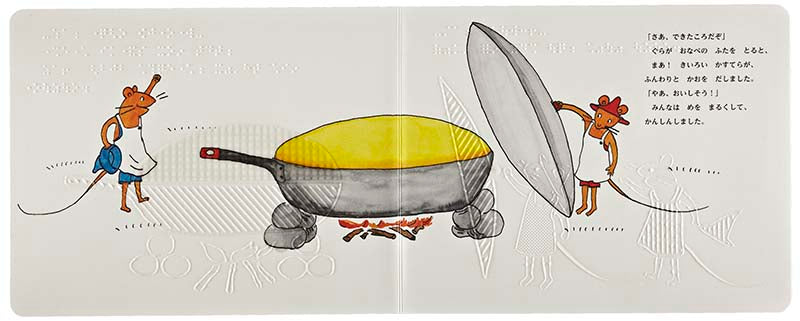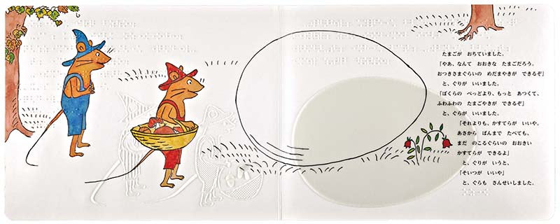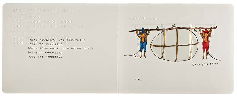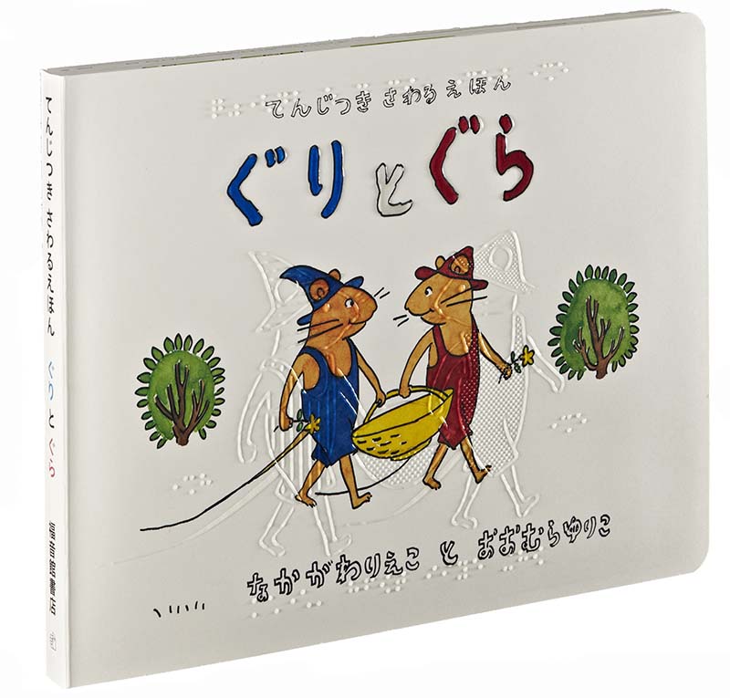 カラー印刷の上に、点字とともに絵柄も透明な樹脂インクで盛り上げて印刷。目で指先で、見える人も見えない人も、一緒に楽しめる「ぐりとぐら」ができました。