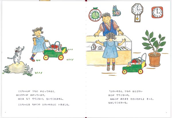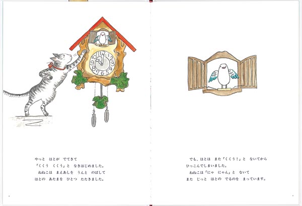 ことちゃんの家には鳩時計があります。猫のねねこは、出てきた鳩にちょっかいを出して、時計を壊してしまいます。でも、時計屋さんから思いがけないプレゼントが。