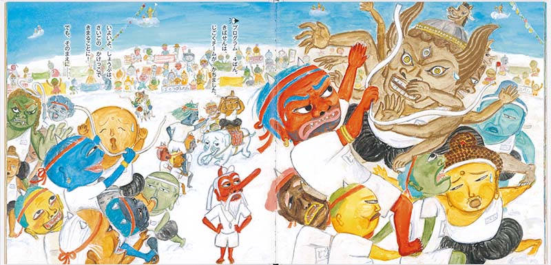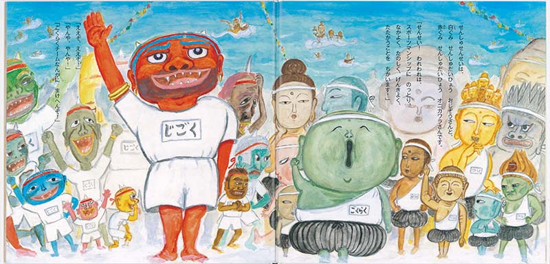 今日は親善運動会。ほとけさんたちの白組とオニたちの赤組が、玉入れ合戦に綱引き、借り物競走、騎馬戦と大奮闘! 最後は勝負をきめる、かけっこです。ところが・・・・・