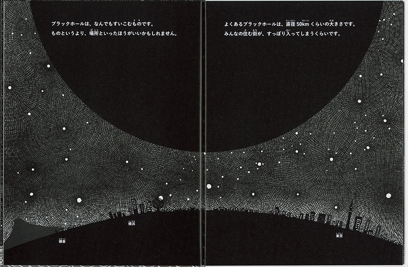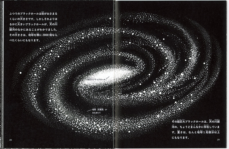 謎の天体、ブラックホールをわかりやすく紹介。ブラックホールのなりたちやしくみ、意外な役割まで、モノクロのあたたかみのある絵とともに描きます。