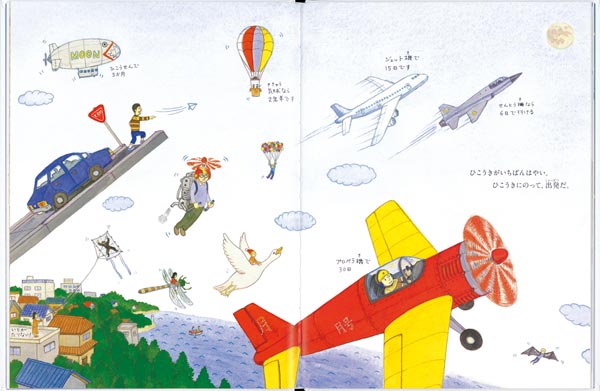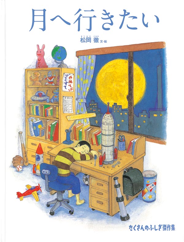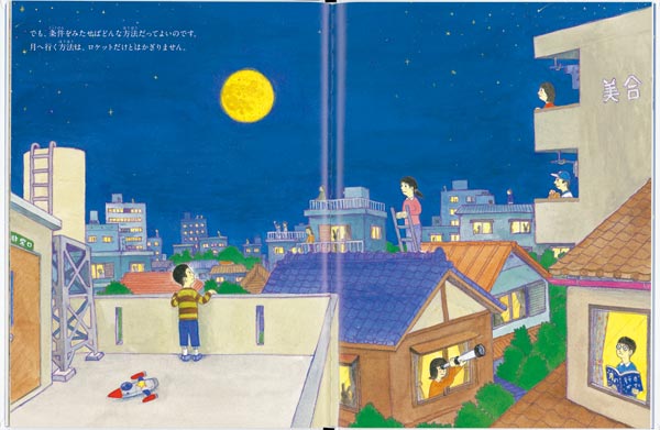 満月の夜、男の子は月へ行く方法をあれこれ考えはじめました。巨大な橋、高い高い塔、風船、エレベーター。人類が旅したいちばん遠い場所、月まで38万キロの旅へ出発!